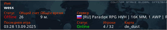 Играет на Counter Strike Global Offensive сервере. Страна: РоссияПервый раз замечен 03:19 13.09.2025