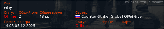 Играет на Counter Strike Source сервере. Страна: РоссияПервый раз замечен 19:05 03.12.2025