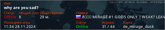 Играет на Counter Strike Global Offensive сервере. Страна: РоссияПервый раз замечен 12:43 17.11.2024