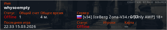 Играет на Counter Strike Source сервере. Страна: РоссияПервый раз замечен 22:27 15.03.2026
