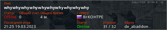 Играет на Counter Strike 1.6 сервере. Страна: РоссияПервый раз замечен 21:23 19.03.2023