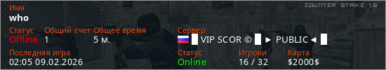 Играет на Counter Strike 1.6 сервере. Страна: РоссияПервый раз замечен 02:03 09.02.2026