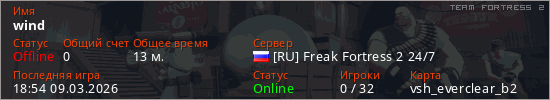 Играет на Team Fortress 2 сервере. Страна: РоссияПервый раз замечен 18:31 08.03.2026