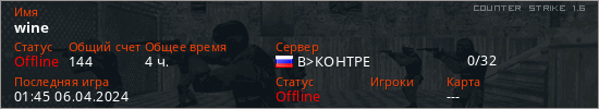 Играет на Counter Strike 1.6 сервере. Страна: РоссияПервый раз замечен 00:57 12.02.2022