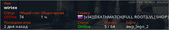 Играет на Counter Strike Source сервере. Страна: РоссияПервый раз замечен 13:51 08.11.2025