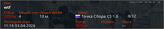Играет на Counter Strike 1.6 сервере. Страна: РоссияПервый раз замечен 10:34 24.03.2026