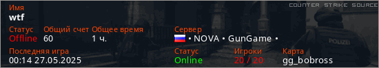 Играет на Counter Strike Source сервере. Страна: РоссияПервый раз замечен 22:39 25.01.2023