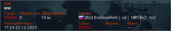 Играет на Counter Strike Global Offensive сервере. Страна: РоссияПервый раз замечен 00:43 22.12.2025