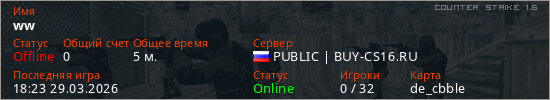 Играет на Counter Strike 1.6 сервере. Страна: РоссияПервый раз замечен 17:52 29.03.2026