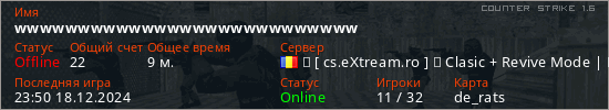 Играет на Counter Strike 1.6 сервере. Страна: РумынияПервый раз замечен 23:36 18.12.2024