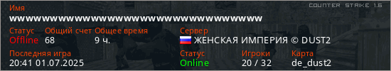 Играет на Counter Strike 1.6 сервере. Страна: РоссияПервый раз замечен 16:23 10.08.2021