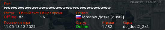 Последний раз был в сети 11:05 13.12.2025 Игрок с таким ником замечен на 31 сервере