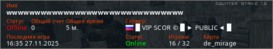 Последний раз был в сети 16:35 27.11.2025 Игрок с таким ником замечен на 31 сервере