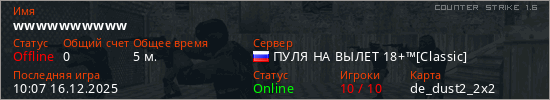 Играет на Counter Strike 1.6 сервере. Страна: РоссияПервый раз замечен 10:05 16.12.2025