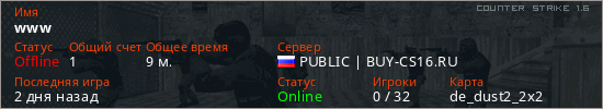 Играет на Counter Strike 1.6 сервере. Страна: РоссияПервый раз замечен 23:30 26.03.2026