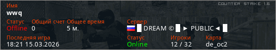 Играет на Counter Strike 1.6 сервере. Страна: РоссияПервый раз замечен 18:16 15.03.2026
