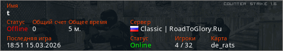 Играет на Counter Strike 1.6 сервере. Страна: РоссияПервый раз замечен 18:46 15.03.2026