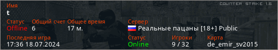 Играет на Counter Strike 1.6 сервере. Страна: РоссияПервый раз замечен 11:24 01.01.2024