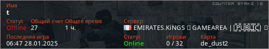 Последний раз был в сети 06:47 28.01.2025 Игрок с таким ником замечен на 40 серверах