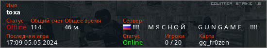 Играет на Counter Strike 1.6 сервере. Страна: РоссияПервый раз замечен 14:49 24.03.2023