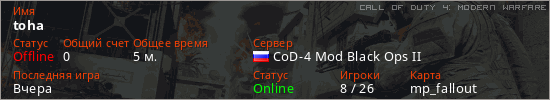 Играет на Call of Duty 4: Modern Warfare сервере. Страна: РоссияПервый раз замечен 11:26 24.03.2026