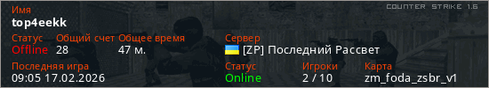 Играет на Counter Strike 1.6 сервере. Страна: УкраинаПервый раз замечен 19:46 10.02.2026