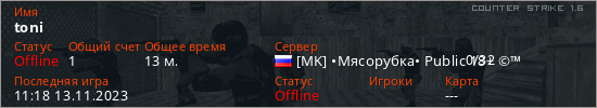 Играет на Counter Strike 1.6 сервере. Страна: РоссияПервый раз замечен 17:19 06.11.2023
