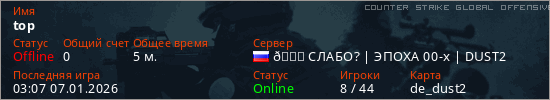 Играет на Counter Strike Global Offensive сервере. Страна: РоссияПервый раз замечен 02:25 07.01.2026