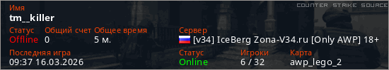 Играет на Counter Strike Source сервере. Страна: РоссияПервый раз замечен 09:35 16.03.2026
