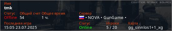Играет на Counter Strike Source сервере. Страна: РоссияПервый раз замечен 16:31 16.04.2023