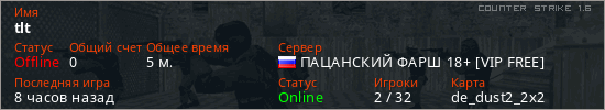 Последний раз был в сети 6 часов назад Игрок с таким ником замечен на 8 серверах