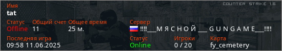 Играет на Counter Strike 1.6 сервере. Страна: РоссияПервый раз замечен 13:47 24.12.2024