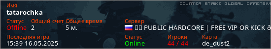 Играет на Counter Strike Global Offensive сервере. Страна: РоссияПервый раз замечен 15:33 16.05.2025