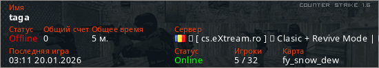 Играет на Counter Strike 1.6 сервере. Страна: РумынияПервый раз замечен 03:09 20.01.2026