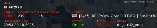 Играет на Counter Strike 1.6 сервере. Страна: СШАПервый раз замечен 18:31 28.01.2025