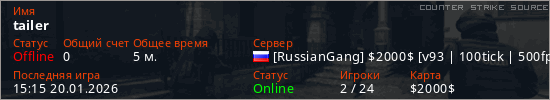 Играет на Counter Strike Source сервере. Страна: РоссияПервый раз замечен 14:50 20.01.2026