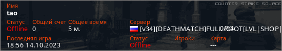 Играет на Counter Strike Source сервере. Страна: РоссияПервый раз замечен 18:53 14.10.2023