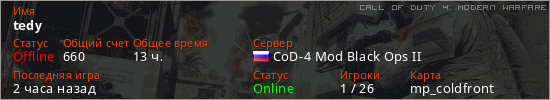 Играет на Call of Duty 4: Modern Warfare сервере. Страна: РоссияПервый раз замечен 20:33 12.02.2024