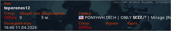 Играет на Counter Strike Global Offensive сервере. Страна: СШАПервый раз замечен 16:38 11.04.2026