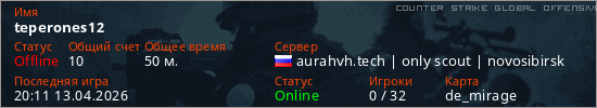 Играет на Counter Strike Global Offensive сервере. Страна: РоссияПервый раз замечен 20:16 10.04.2026