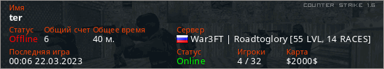 Играет на Counter Strike 1.6 сервере. Страна: РоссияПервый раз замечен 16:36 20.03.2023
