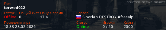 Играет на Counter Strike Source сервере. Страна: РоссияПервый раз замечен 06:26 14.02.2026