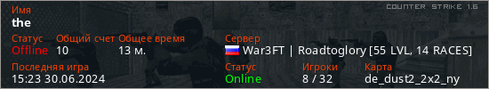Играет на Counter Strike 1.6 сервере. Страна: РоссияПервый раз замечен 13:54 26.02.2024