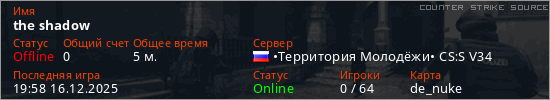 Играет на Counter Strike Source сервере. Страна: РоссияПервый раз замечен 19:56 16.12.2025