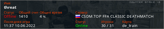 Играет на Counter Strike 1.6 сервере. Страна: РоссияПервый раз замечен 15:12 01.06.2022