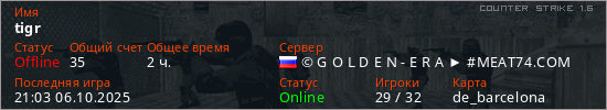 Играет на Counter Strike 1.6 сервере. Страна: РоссияПервый раз замечен 06:41 05.02.2023
