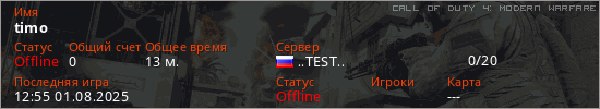Играет на Call of Duty 4: Modern Warfare сервере. Страна: РоссияПервый раз замечен 12:04 01.08.2025