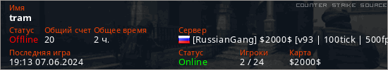Играет на Counter Strike Source сервере. Страна: РоссияПервый раз замечен 19:58 28.06.2023