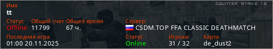Последний раз был в сети 01:00 20.11.2025 Игрок с таким ником замечен на 38 серверах