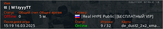 Играет на Counter Strike 1.6 сервере. Страна: РоссияПервый раз замечен 15:13 16.03.2025